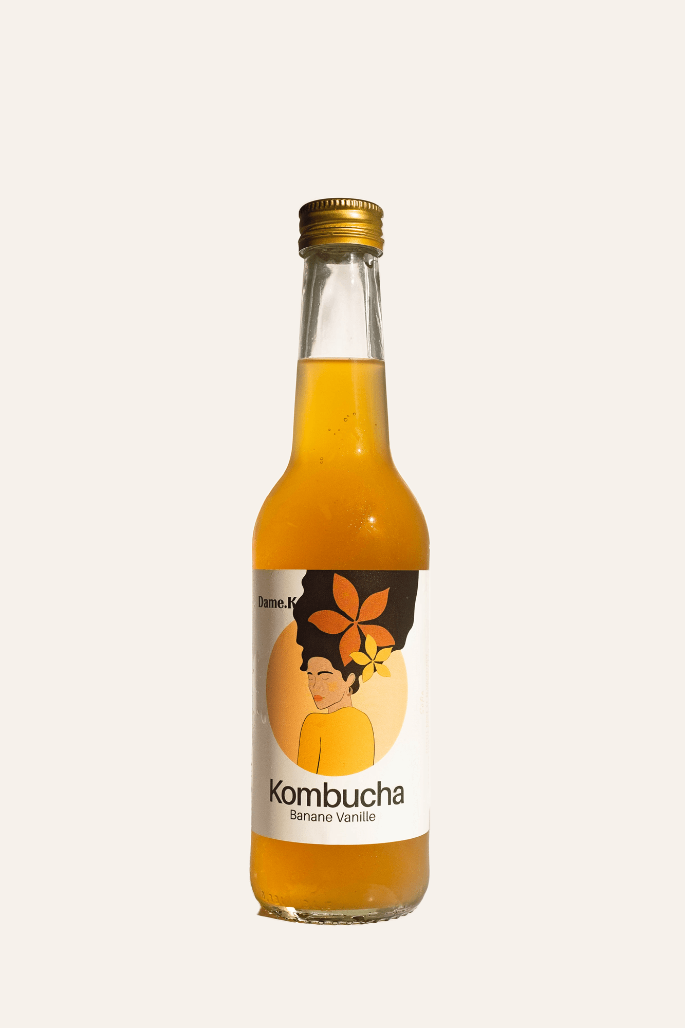Kombucha Dame.K 〰️ Eau dynamisée, culture vivante de kombucha, thé vert* et thé noir*, sucre de canne blond* et roux*, banane* fraiche, gousse de vanille de Madagascar*.