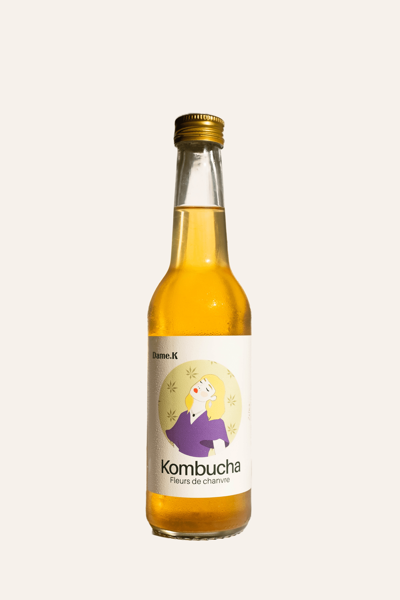 Kombucha Dame.K 〰️ Eau dynamisée, culture vivante de kombucha, thé vert* et thé noir*, sucre de canne blond* et roux*, fleurs de chanvre de La Forêt enchanvrée (09165).