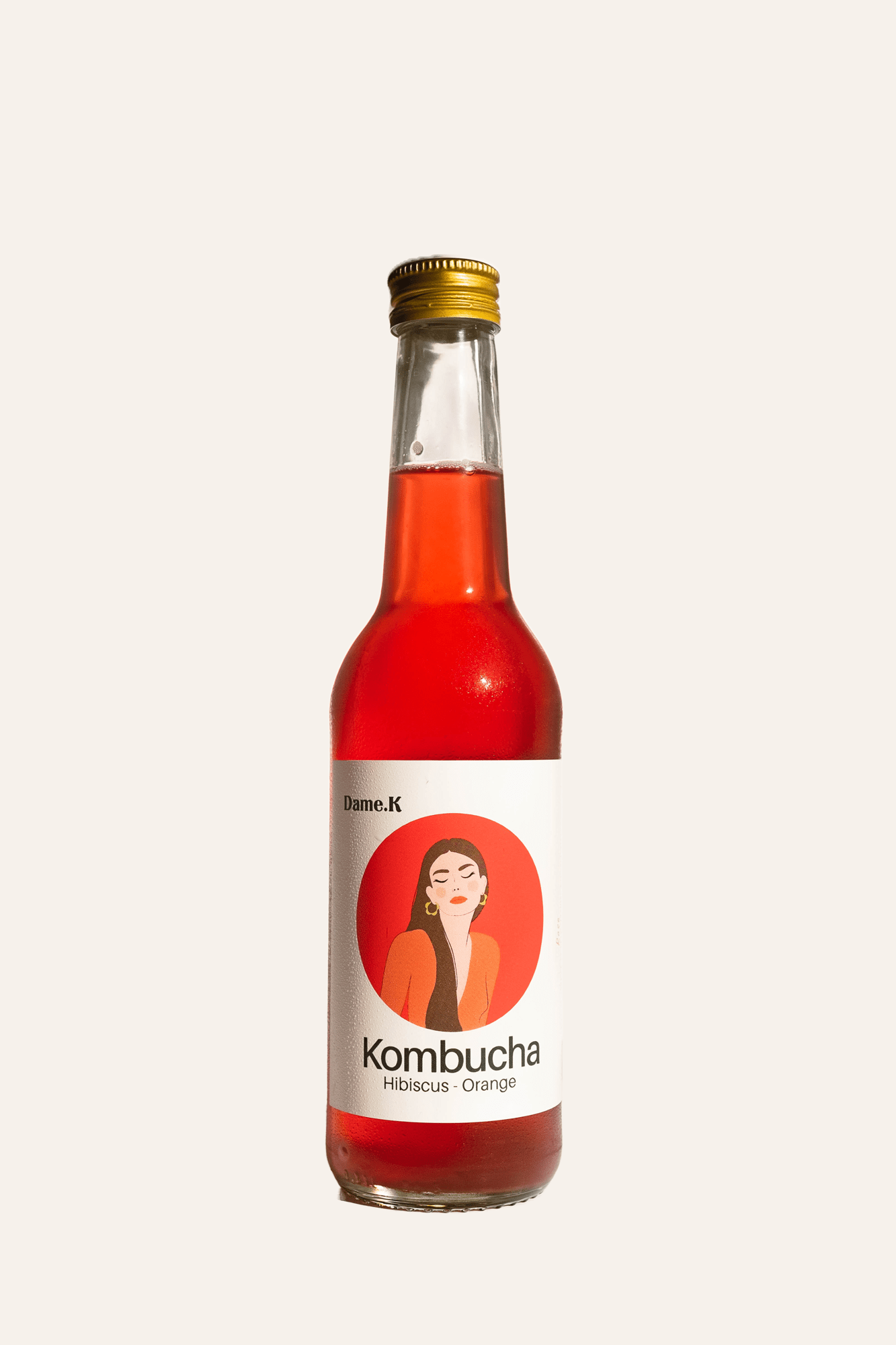 Kombucha Dame.K 〰️ Eau dynamisée, culture vivante de kombucha, thé vert* et thé noir*, sucre de canne blond* et roux*, infusion de fleurs hibiscus*, orange*.