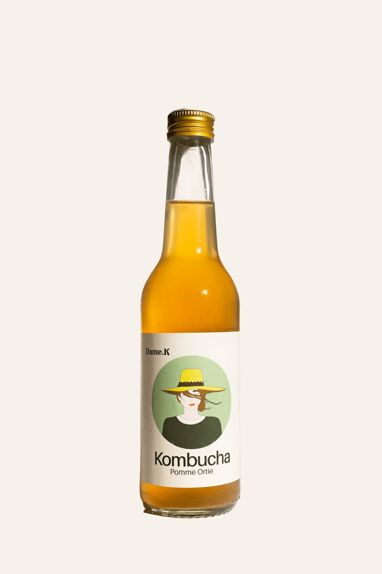 Kombucha Dame.K 〰️ Eau dynamisée, culture vivante de kombucha, thé vert* et thé noir*, sucre de canne blond* et roux*, pomme fraiche*, ortie*.