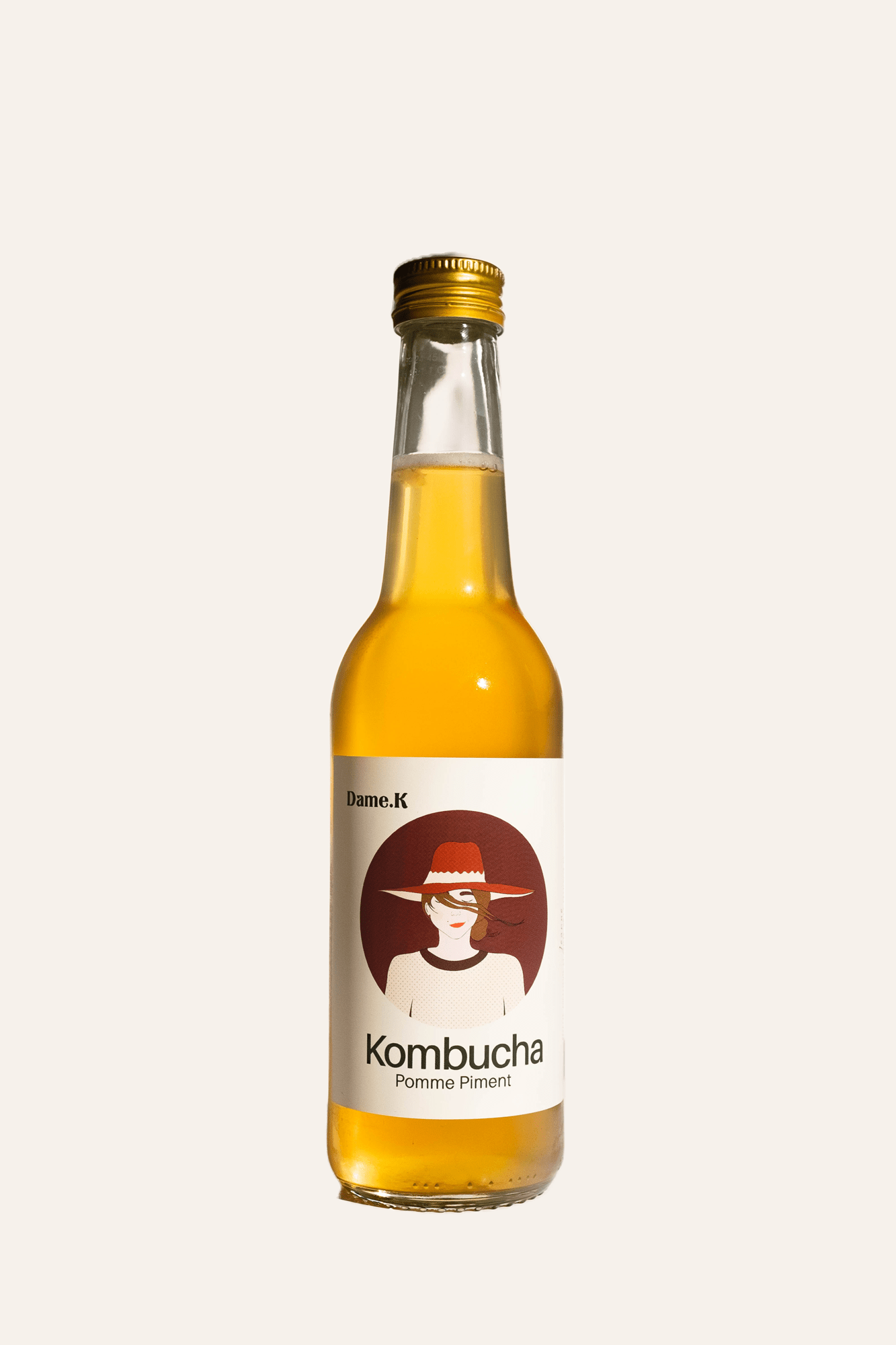 Kombucha Dame.K 〰️ Eau dynamisée, culture vivante de kombucha, thé vert* et thé noir*, sucre de canne blond* et roux*, pomme* fraiche, piment oiseau*.